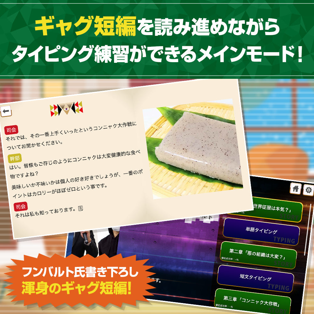 タイピングを練習しながらフンバルト氏渾身のギャグ短篇が読めるメインモードをはじめ、